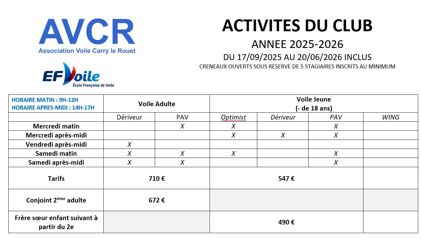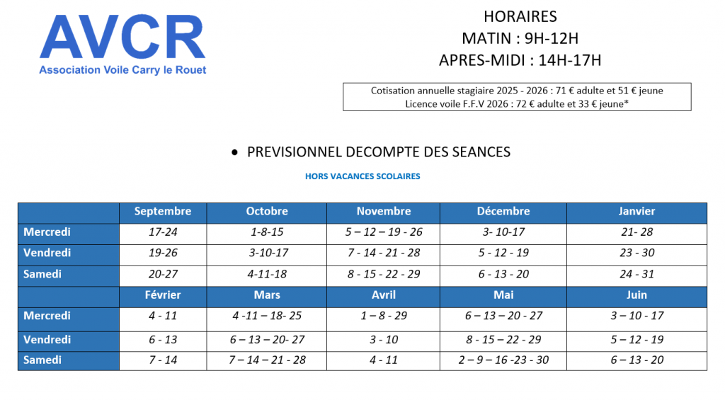 Le planning et les nouveaux tarifs pour la période 2025/2026 :